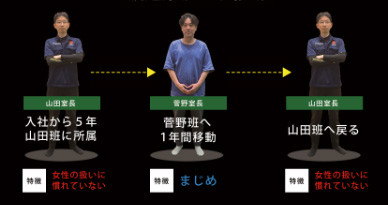 工程管理を苦手とする山田室長に心が折れて一時は「会社を辞めよう」と考えました。 その状況を知った別の室長や社長から制度の利用を勧められて、工程管理が得意な菅野室長のもとへ異動しました。 オーバーワークは解消しましたが、離れてみて山田室長の技術の守備範囲の広さや本音を言いやすい人柄の良さに気づかされ、翌年に山田室長の下へ戻りました。 工程管理スキルを菅野室長から学べたおかげで、今では山田室長の不得意な部分をサポートできるようになりました。